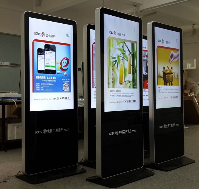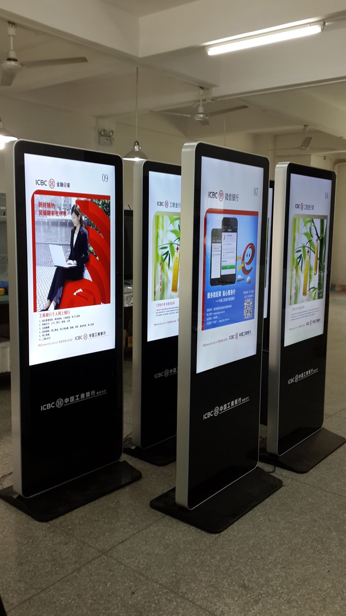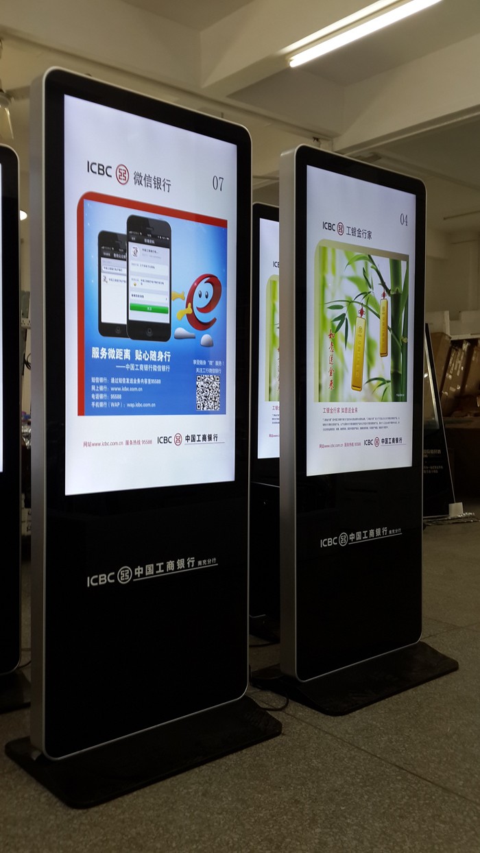 顯示終端性能不斷提高,成本大幅度降低,將會逐漸取代傳統的LED電子顯示屏。以下是為中國工商銀行烏魯木齊分行生產的42寸蘋果落地網絡版廣告機及觸摸查詢一體機,立體式的像客戶展示熱門的資訊。