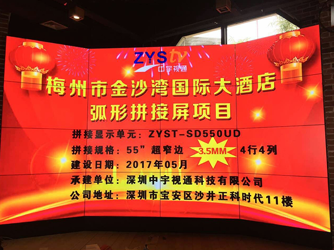 梅州金沙灣國(guó)際大酒店55寸3.5mm拼縫4行4列弧形液晶拼接屏完美驗(yàn)收